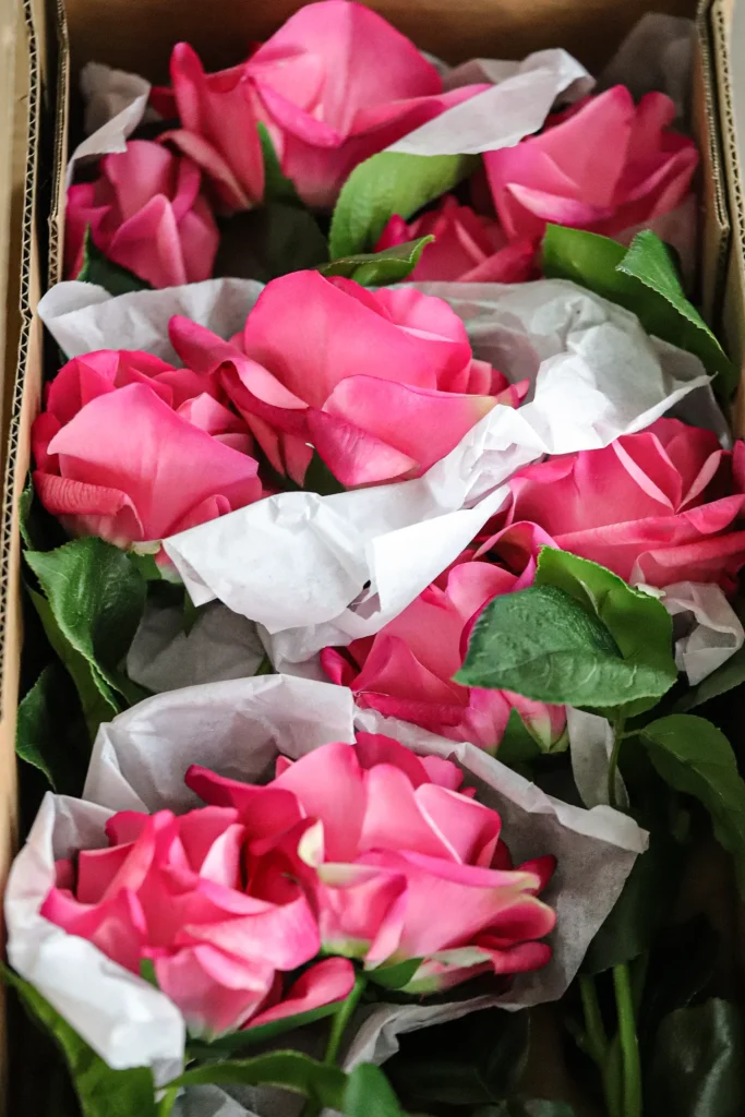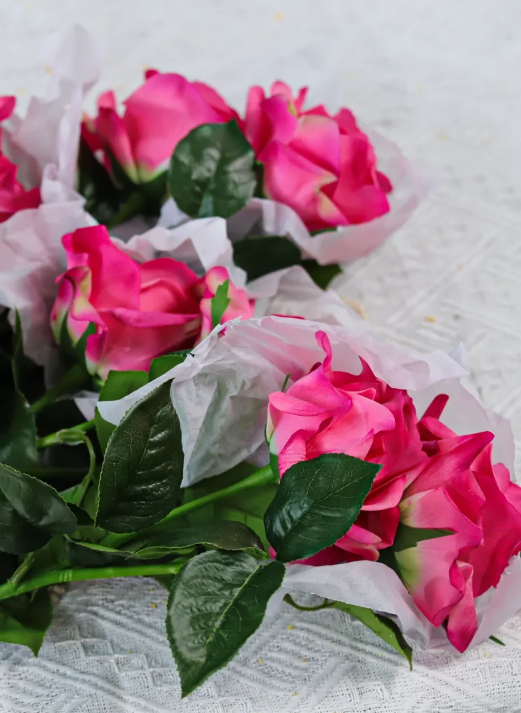 The stems and petals are usually bent for shipping. To restore their shape, gently and manually bend the internal wire stems to reshape the bouquet or arrangement. You can also use a low-setting hairdryer to carefully soften and reshape crumpled petals.