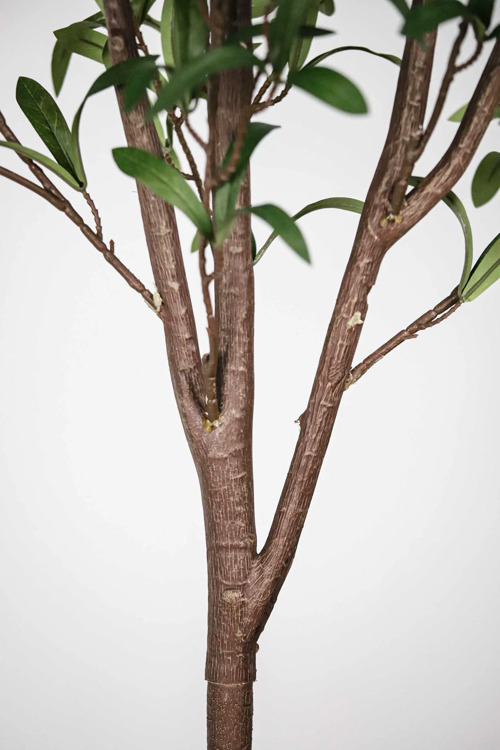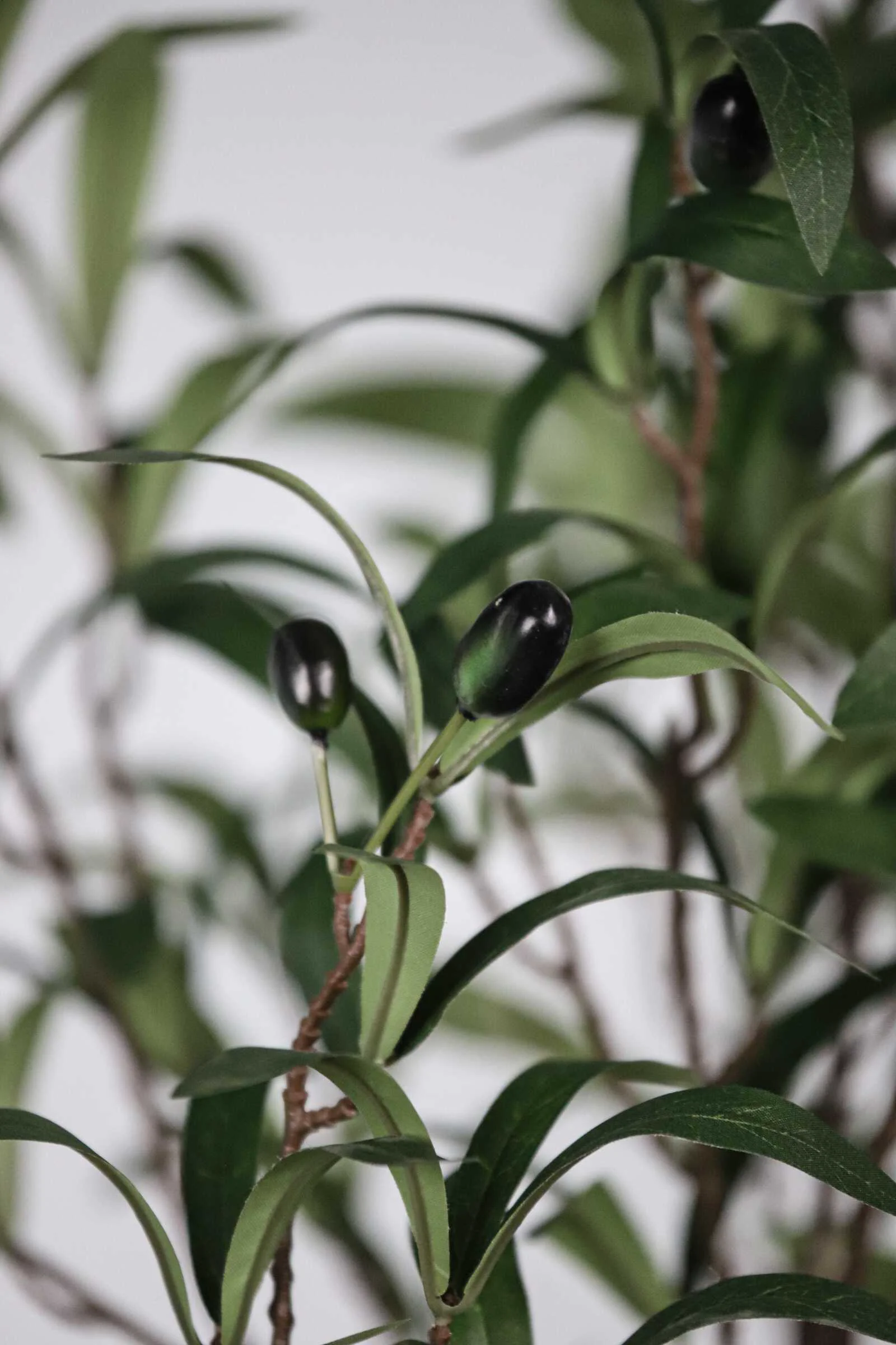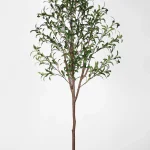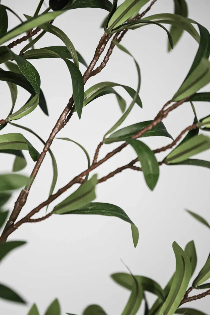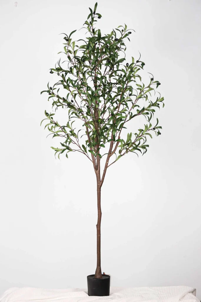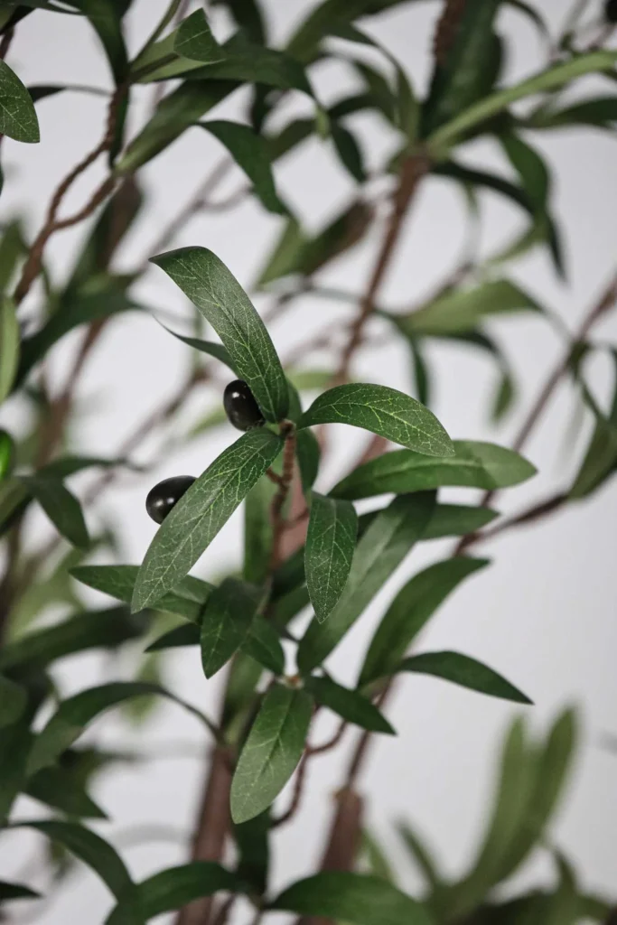 This artificial Olive tree features a 4-section removable trunk, foam gradient fruits in various sizes, and dense triple-leaf clusters. The trunk has a natural texture and a custom color finish for lifelike appeal.