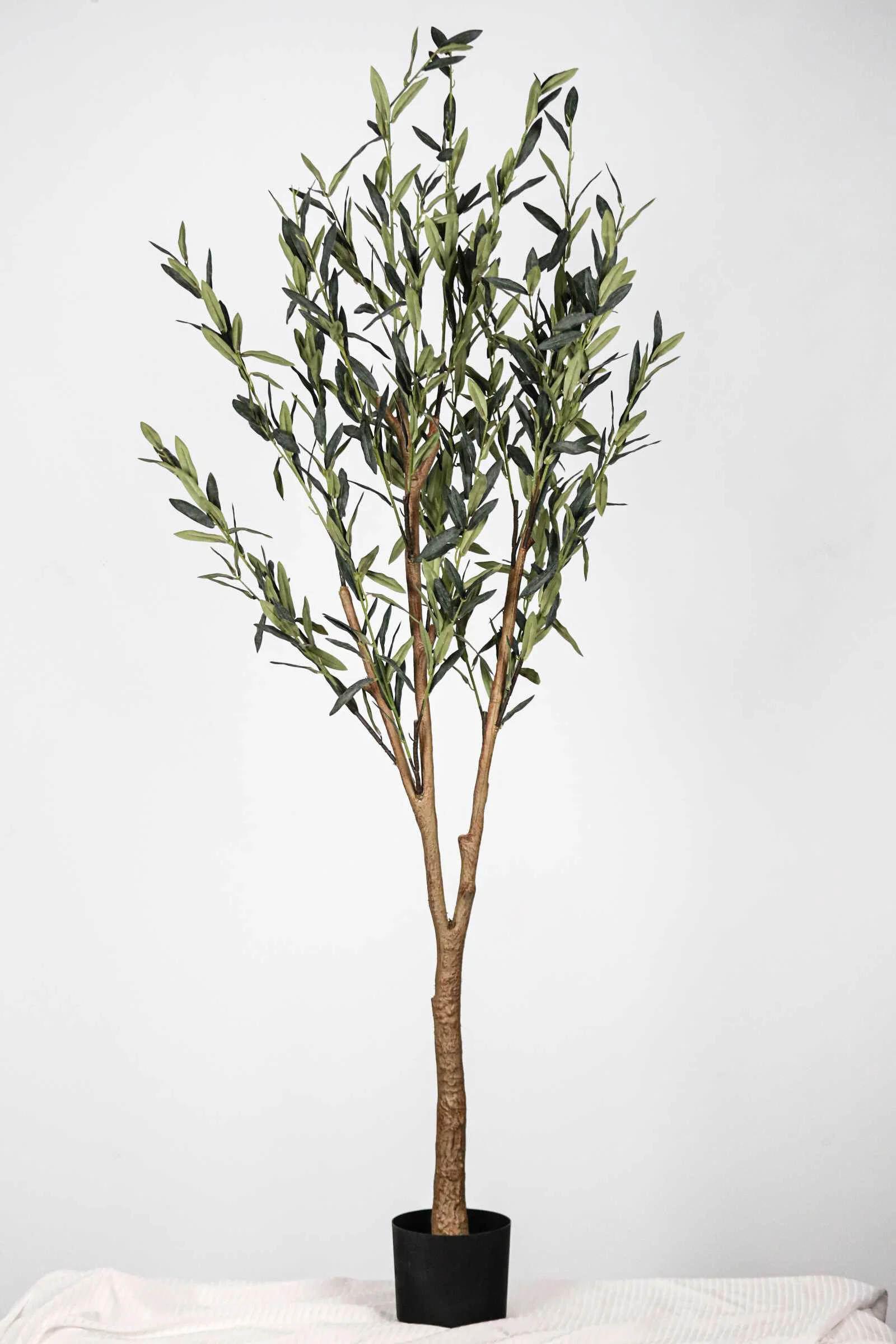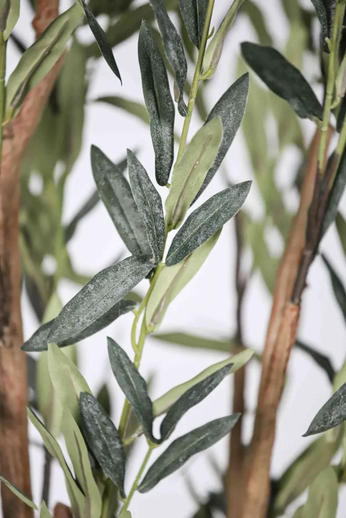 This faux Olive tree features silk leaves with a weathered white-tip finish, downward-curving design, and a textured trunk for a natural touch—perfect for indoor decor with zero maintenance.