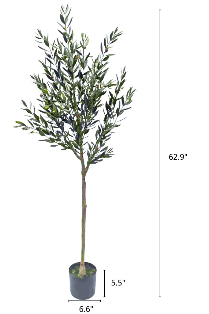 Faux Olive Tree with Realistic Trunk Indoor Décor-62.99″ delivers a lifelike natural-textured trunk with authentic bark and lush silvery-green olive leaves with detailed veins. This 62.99-inch tall faux plant requires no maintenance – zero watering or sunlight needed – keeping vibrant greenery year-round. Its realistic trunk and foliage create an elegant Mediterranean presence, perfect for indoor spaces. Effortlessly enhances living rooms, offices, or commercial settings with timeless natural charm and Mediterranean flair without any care requirements.