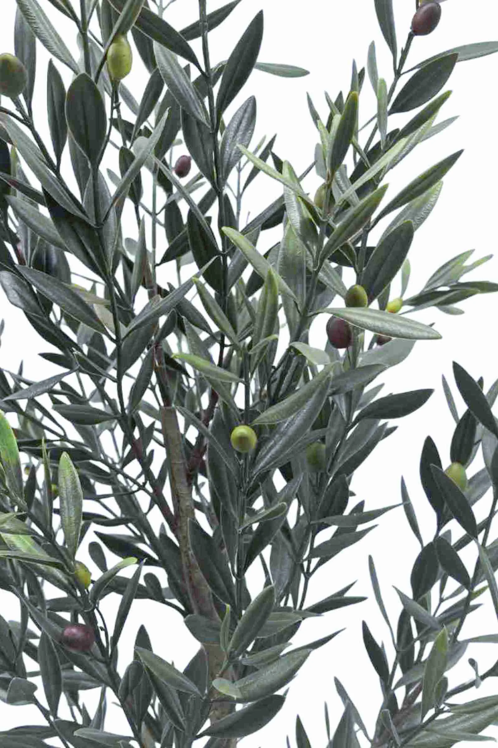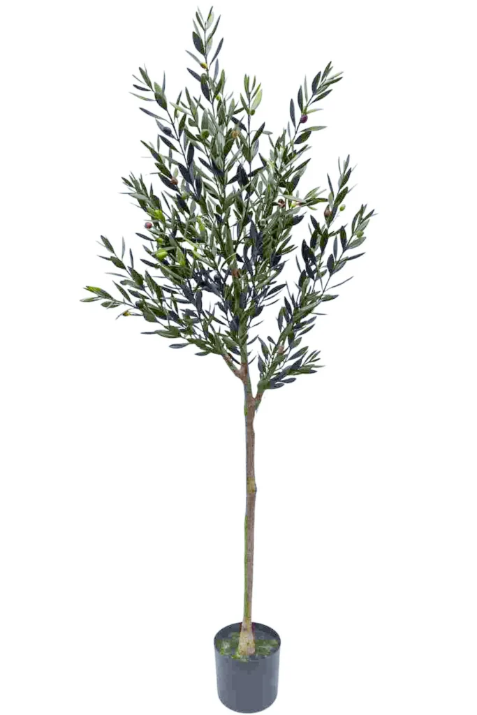 This faux Olive tree features rubber leaves, realistic foam fruits in varied sizes and colors, a lifelike trunk, and faux moss in the pot—ideal for effortless indoor greenery and lasting charm.