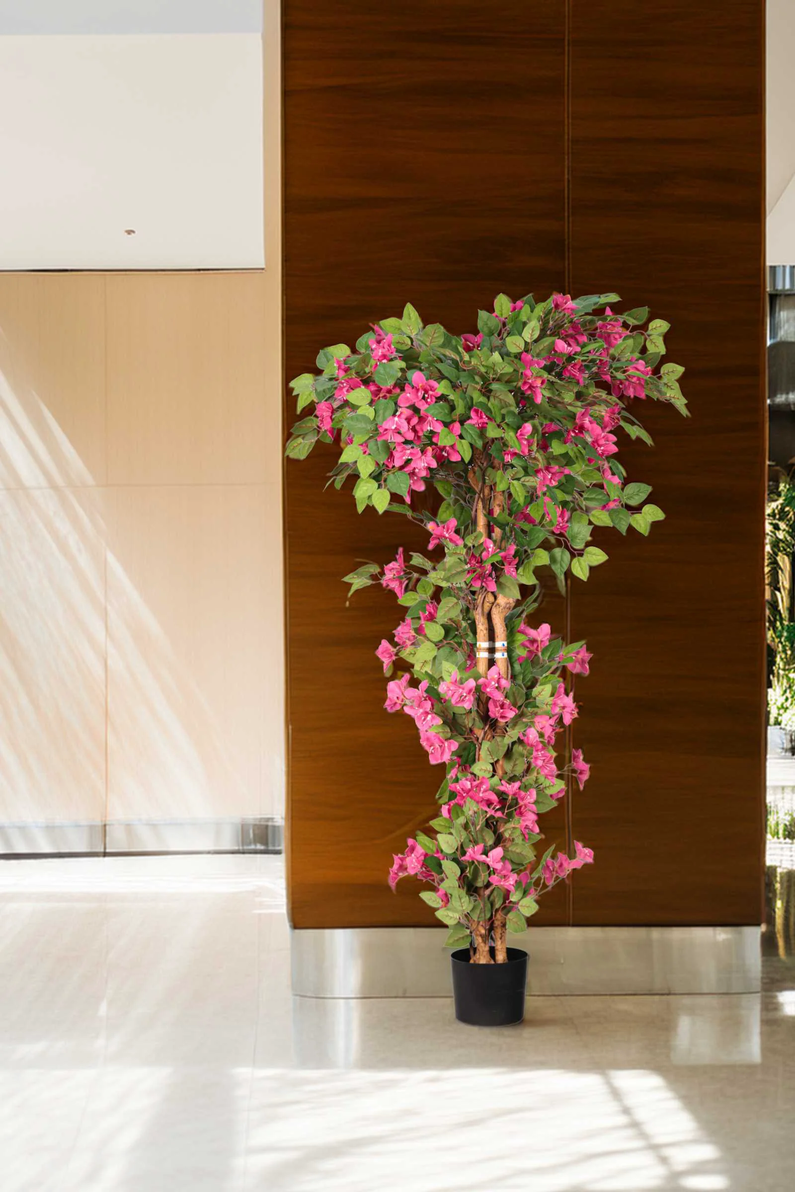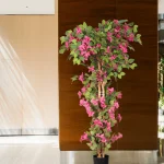Bring vibrant, Mediterranean charm into your space with our outdoor artificial bougainvillea trees. Featuring a trunk with realistic texture and hand-applied color treatment, this tree captures the look of natural growth. The real vine wrapping adds an authentic touch, while the eco-friendly, detachable design makes transport and installation easy. Delicately printed fabric leaves and flower branches closely mimic the shape and feel of real bougainvillea, and the umbrella-shaped canopy creates a bold statement in any interior.