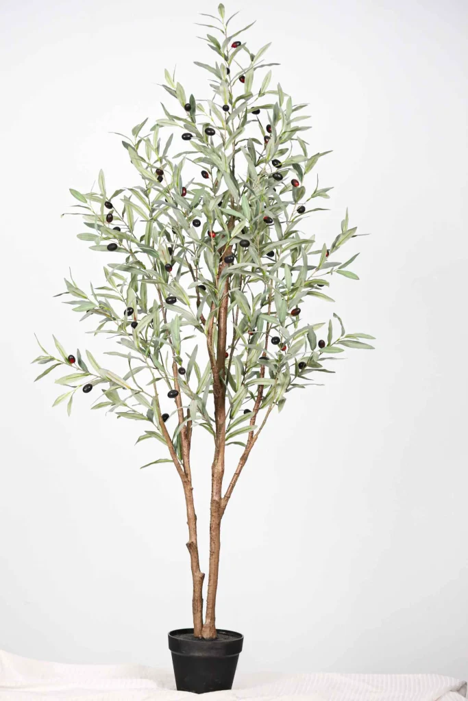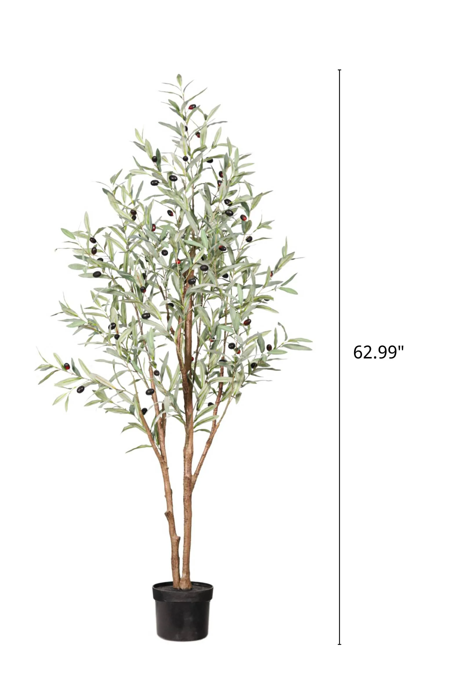 Potted Indoor Faux Olive Tree-62.99″ delivers realistic silvery-green silk leaves with detailed veins and handcrafted gradient olive fruits. The natural-textured trunk enhances its authentic appeal. This 62.99-inch tall pre-potted faux plant comes with a decorative weighted pot and requires no maintenance – zero watering or sunlight needed. Made with durable fade-proof materials, it keeps lush greenery all year round. Ideal for living rooms, bedrooms, offices and entryways, adding Mediterranean sophistication effortlessly. Adjustable branches allow for personalized styling, making it perfect for any indoor space.
