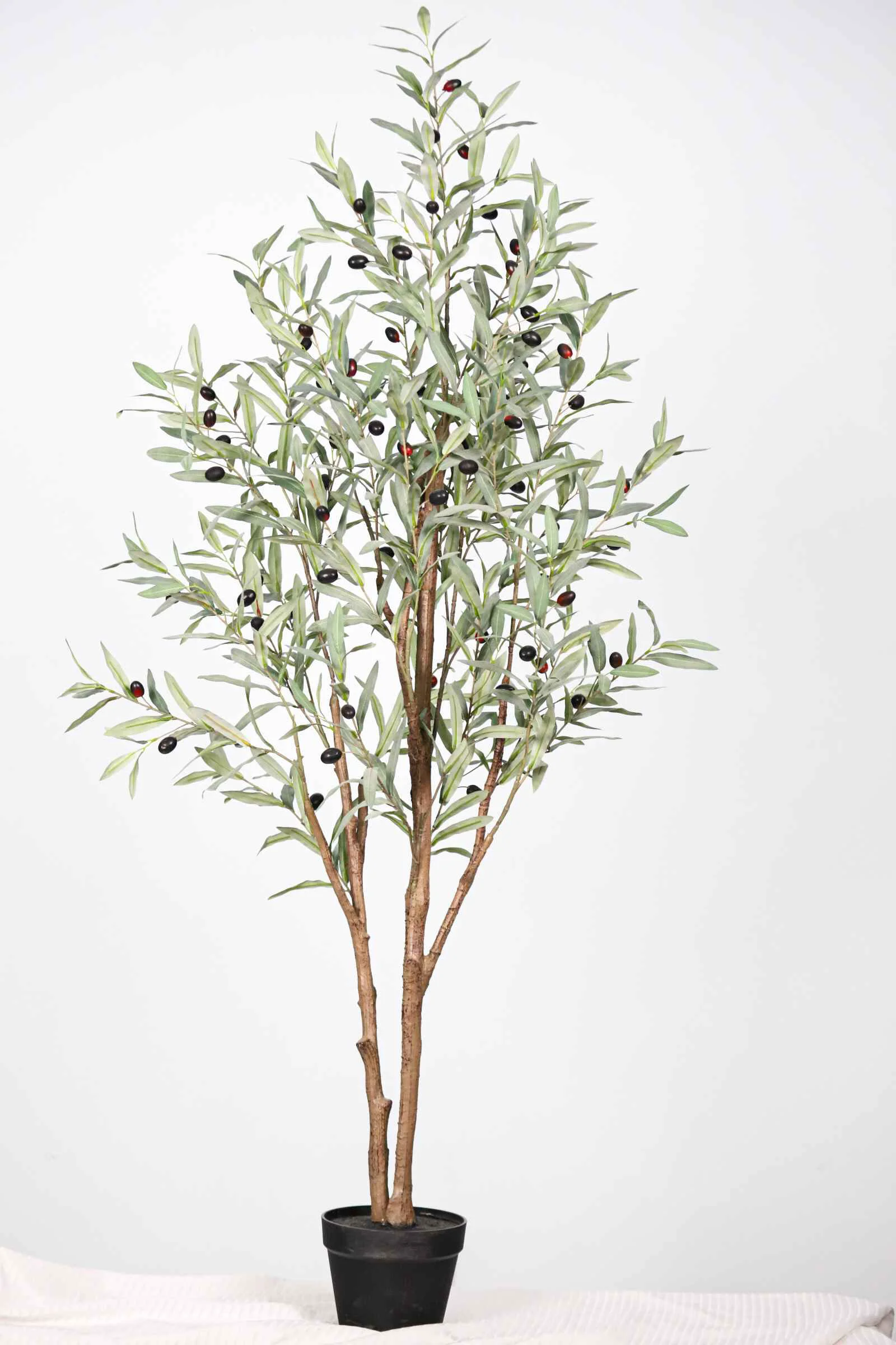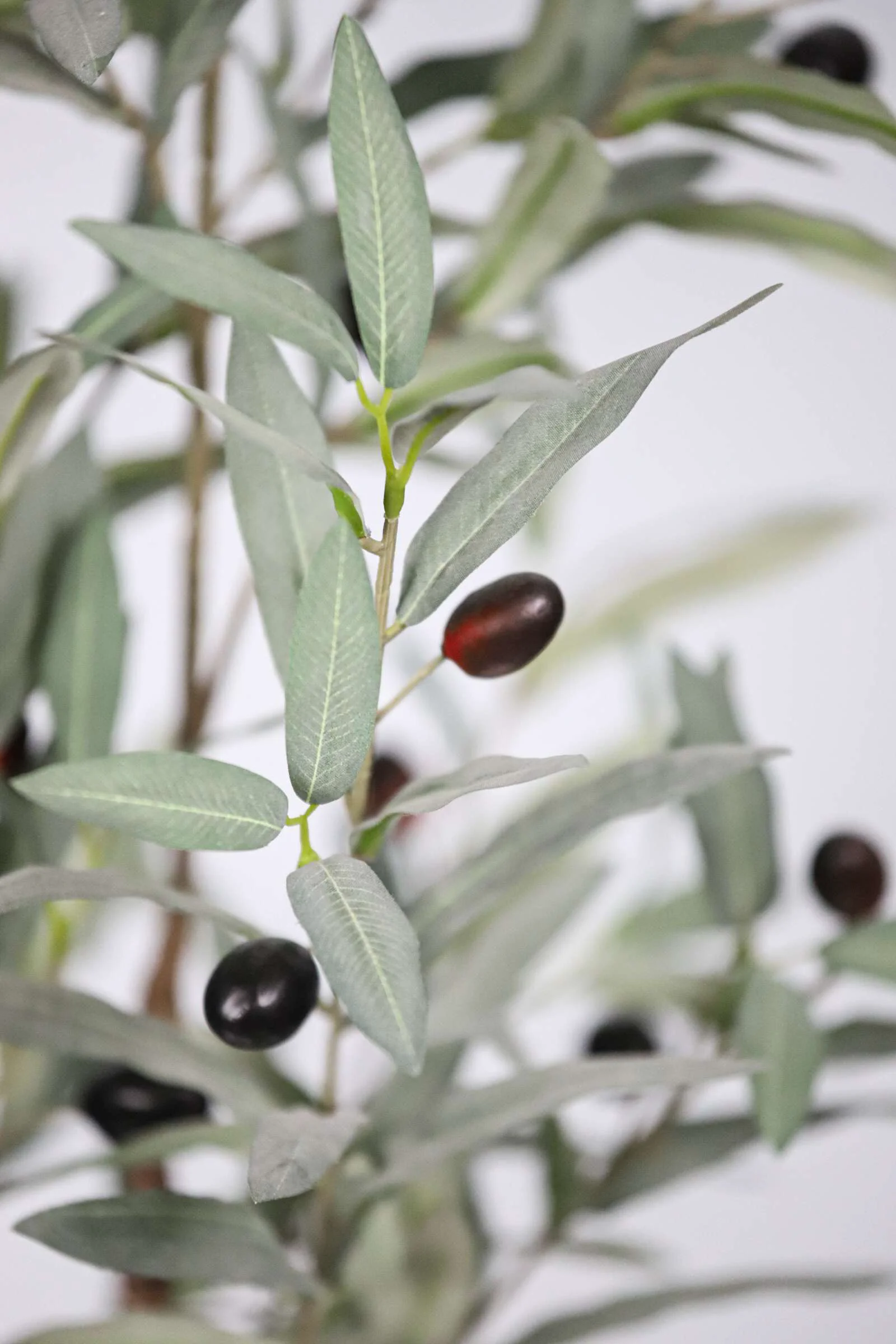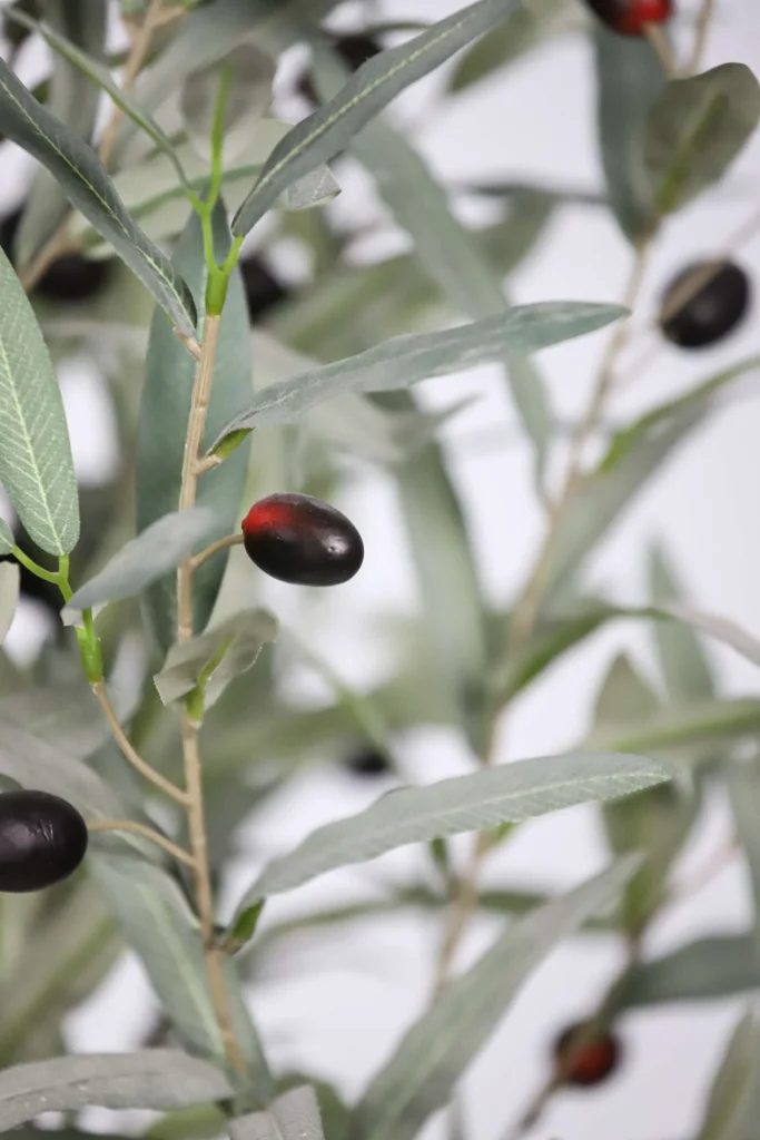 This faux Olive tree features gradient foam olive fruits of varying sizes, weathered white-tipped leaves, and a naturally colored trunk. Realistic, durable, and perfect for indoor décor or commercial display.
