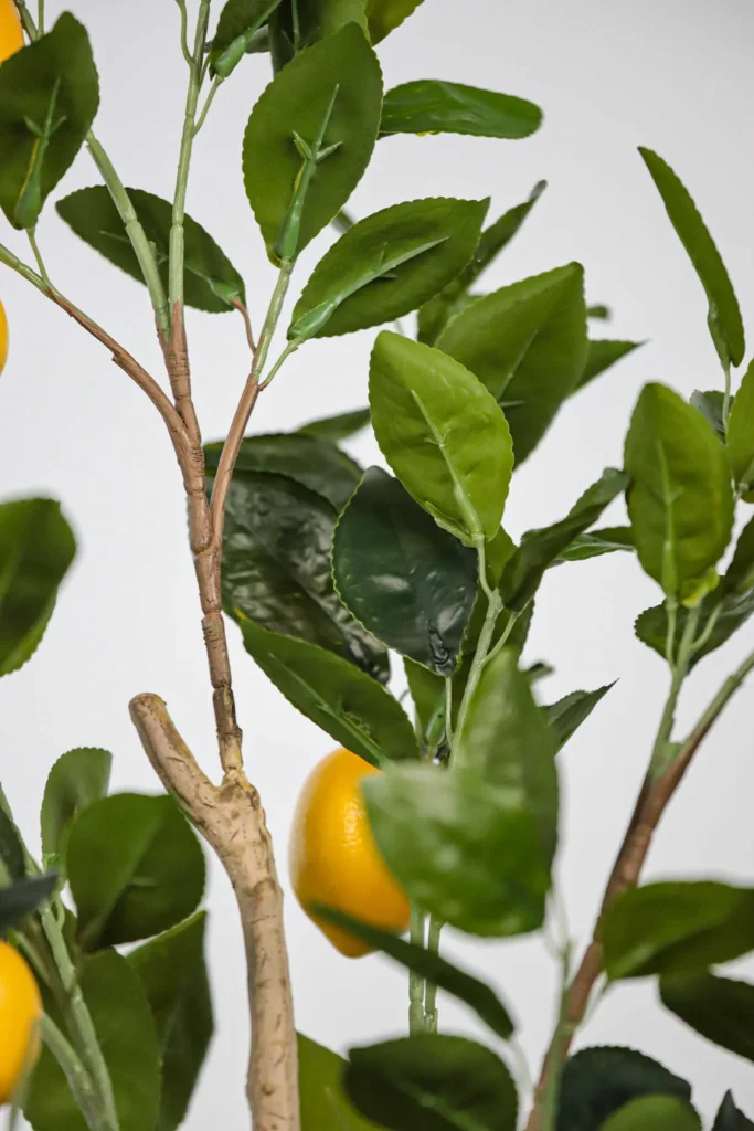 Realistic Faux Lemon Tree with Removable Branches-59.05″ features lush glossy green leaves with authentic vein textures, vibrant yellow lemons with natural color gradients and a sturdy natural-textured trunk. The highlight is its innovative removable branch design, allowing customization of fullness and shape while simplifying storage and shipping. Crafted with premium fade-resistant materials, this 59.05-inch faux tree is 100% maintenance-free – no watering, pruning or sunlight needed. Perfect for indoor home, kitchen or office decor, effortlessly bringing Mediterranean charm with year-round vibrant greenery and realistic lemon accents.