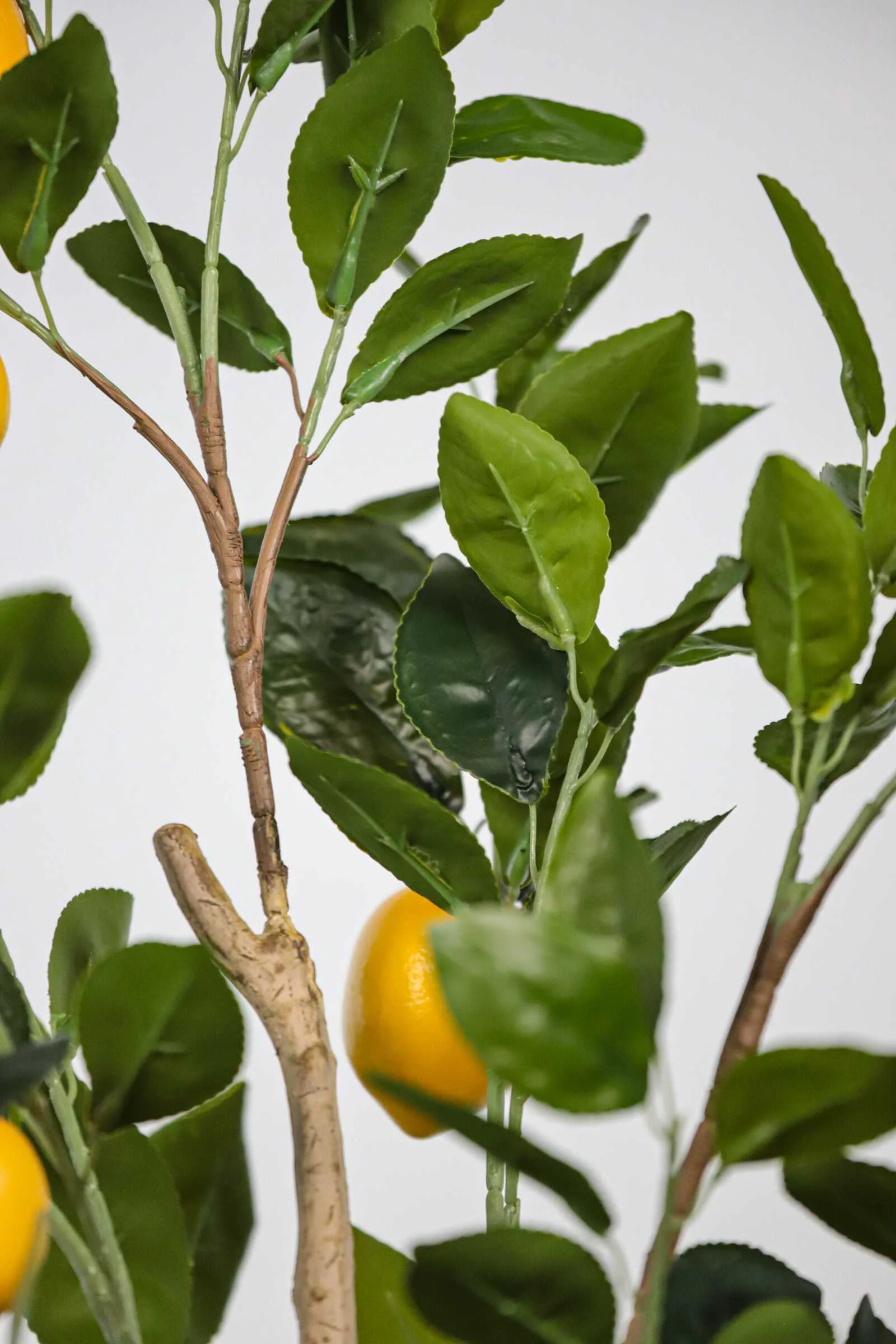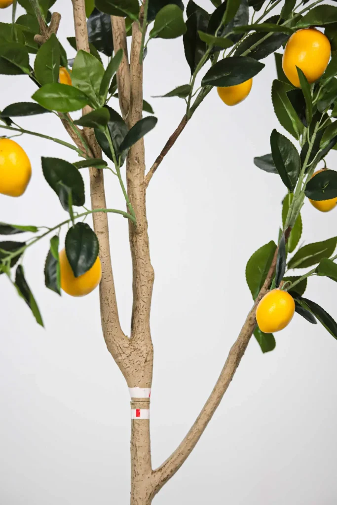 This faux Lemon tree features removable branches that save packaging and shipping costs. Crafted with rubberized fabric leaves and vibrant lemons, it’s perfect for any decor.